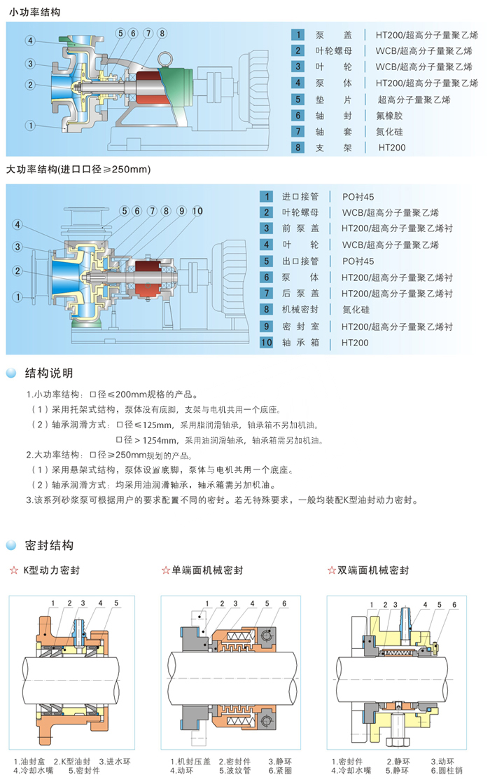 该系列泵采用多种密封方式:K型动力密封、单端面机械密封和双端面机械密封,可根据具体工况条件选用。